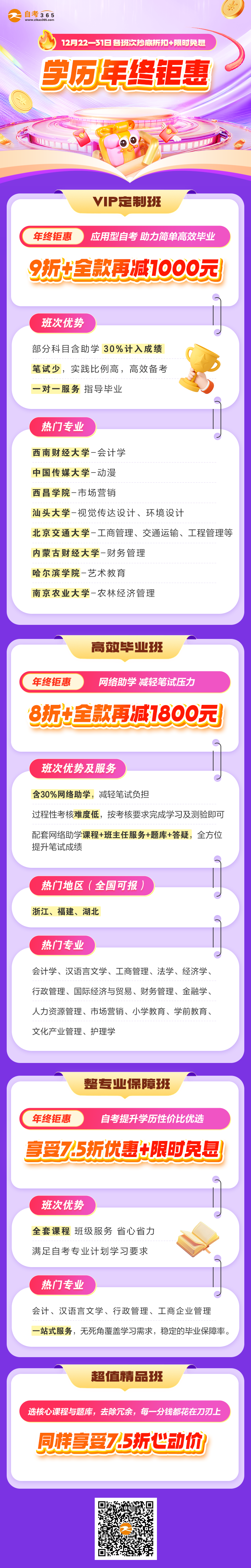 当前位置:首页> 备考资料 > 自考年终钜惠 各班次抄底折扣+限时免息