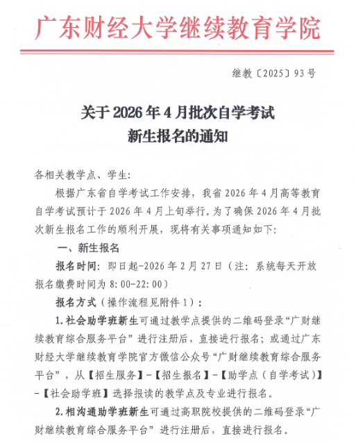 广东财经大学关于2026年4月批次自学考试新生报名的通知